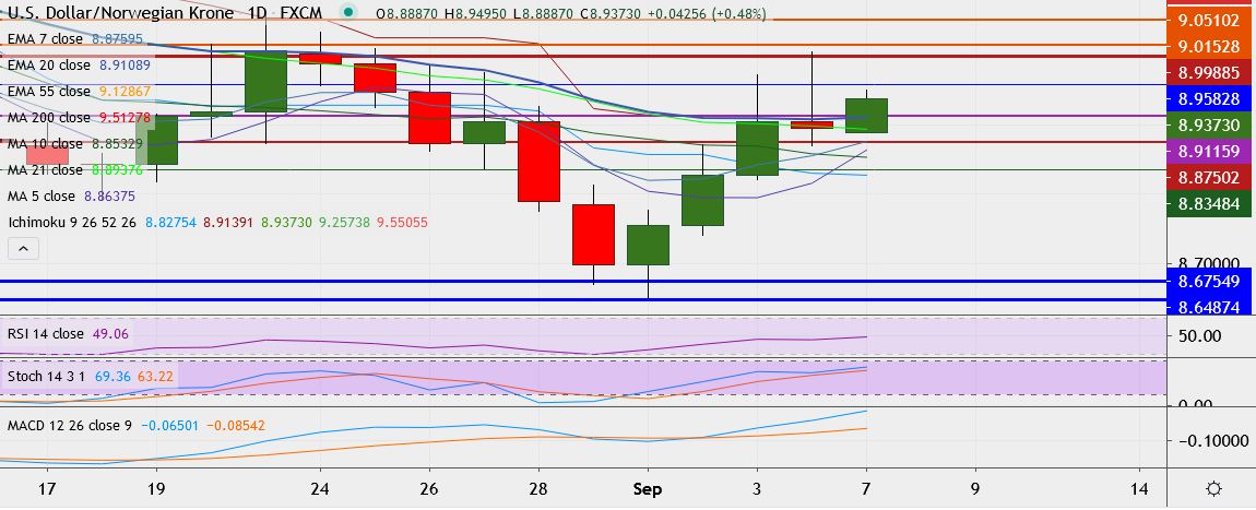 - USD/NOK trades 0.4 percent higher at 8.9330, having touched a high of 9.0044 the prior session, its highest since August 25.