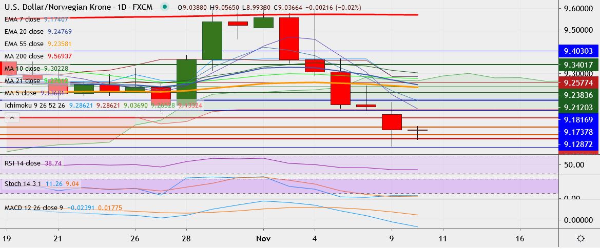 - USD/NOK trades 0.05 percent lower at 9.0320, having touched a low of 8.9644 on Monday, its lowest since September 10.