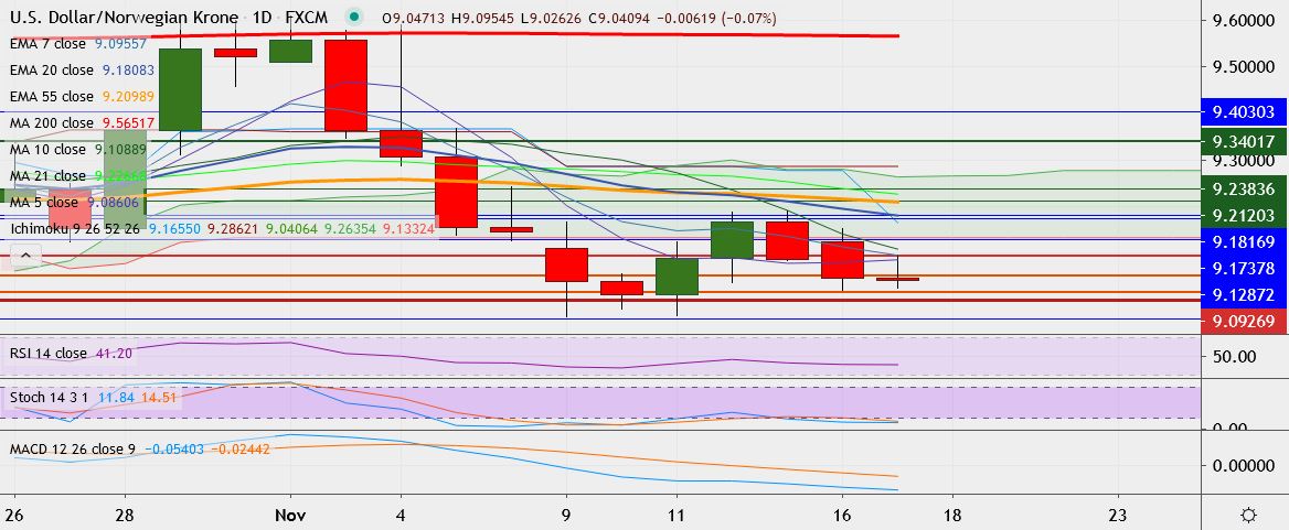 - USD/NOK trades 0.1 percent lower at 9.0426, having touched a low of 9.0203 on Monday, its lowest since November 11.