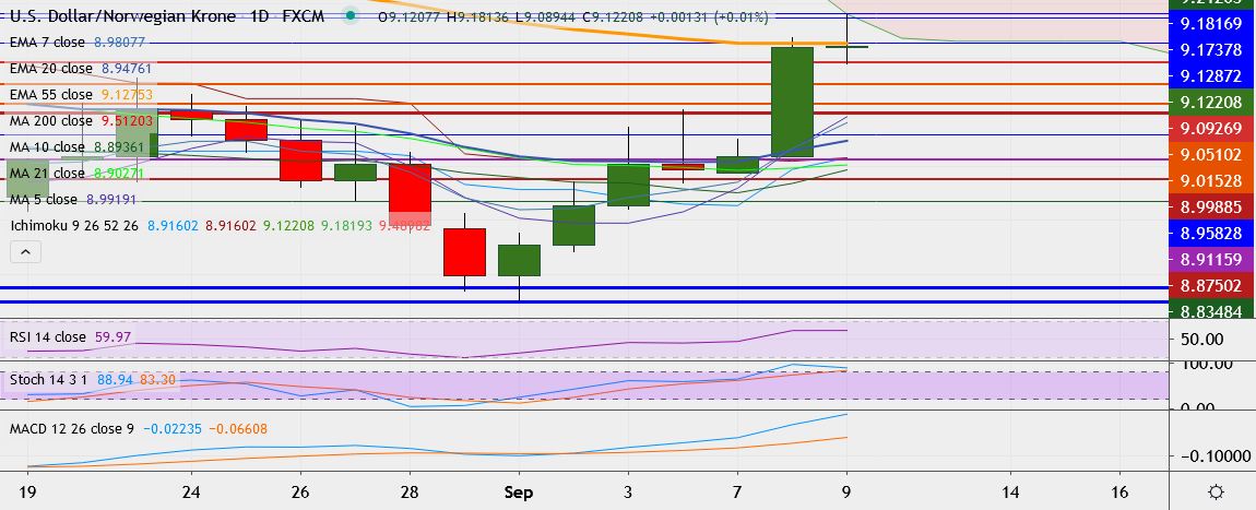 - USD/NOK trades flat at 9.1184, having touched a high of 9.1813 earlier, its highest since July 24.