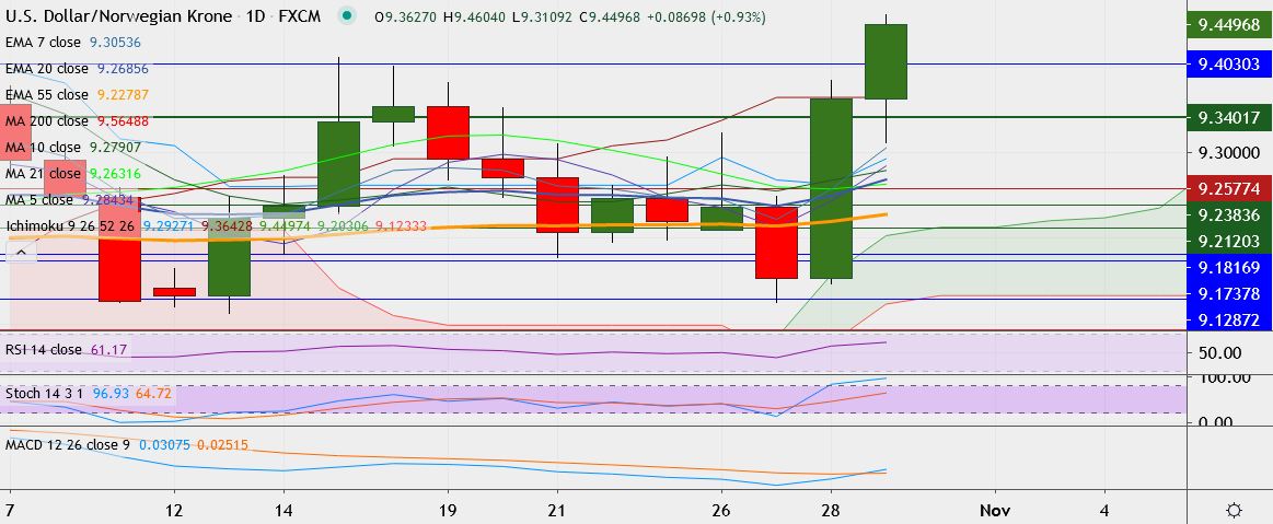 - USD/NOK trades 0.9 percent higher at 9.4530, having touched a high of 9.4604 earlier, its highest since September 30.