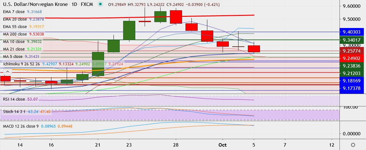 - On the downside, support is around 9.2377 (20-EMA), break below could take it till 9.2192.
