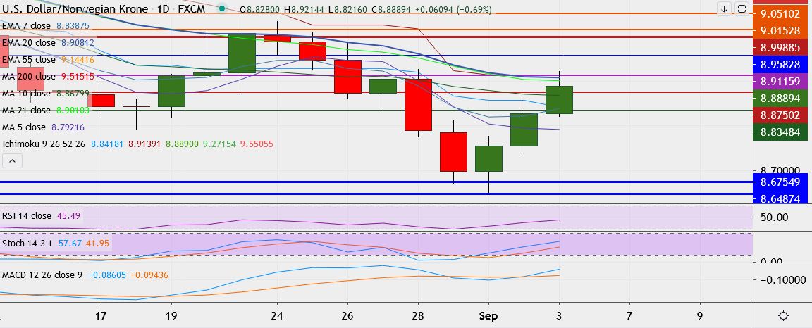 - Immediate resistance is located at 8.9406 close above could take it till 8.9610 (20-EMA).