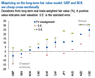 However, the currency has room to weaken further relative to fair value since historically (in 2008), it traded as much as 20% cheap to fair value. Our macro view remains structurally bearish on GBP and we do not believe that a further 5-10% weakening eventually is not unreasonable given the dependence of UK on foreign capital.