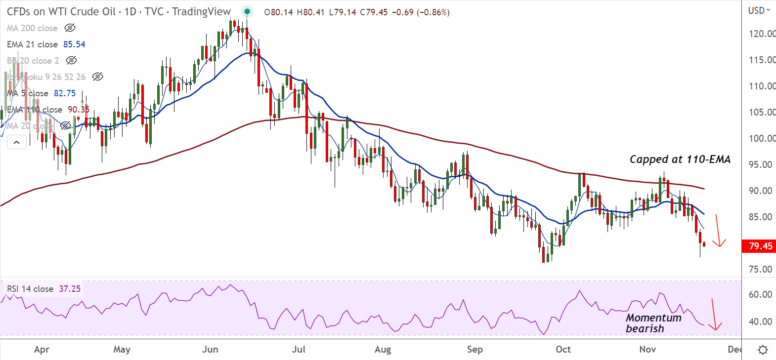 Summary: WTI oil prices poised for further downside. Oversold conditions keep scope for some pullback. Bearish invalidation only above daily cloud.