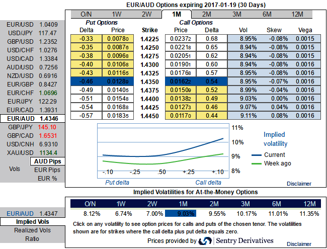 The implied volatilities of 1m EURAUD ATM contracts are trading shy above 9%, while the spot price in technical trend approaching near crucial juncture at the resistance of falling wedge, it seems to be equal opportunity for both bulls and bears. It has become a quite tough call for anyone to predict the short term trend but slightly favouring upside traction in near terms.