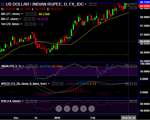 Technically, although USDINR showing some upside potential, it has been losing upswings momentum from last couple of trading days as the rejection of resistance at 68.7539 levels.