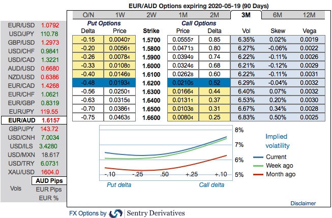 OTC Indications and Options Strategy: Please be noted that IV skews of EURAUD are stretched on either side, the positively skewed IVs of 3m tenors are signifying more hedging interests in bullish risks. More bids for OTM calls of this tenor indicate that the underlying spot FX likely to spike up to 1.66 levels.