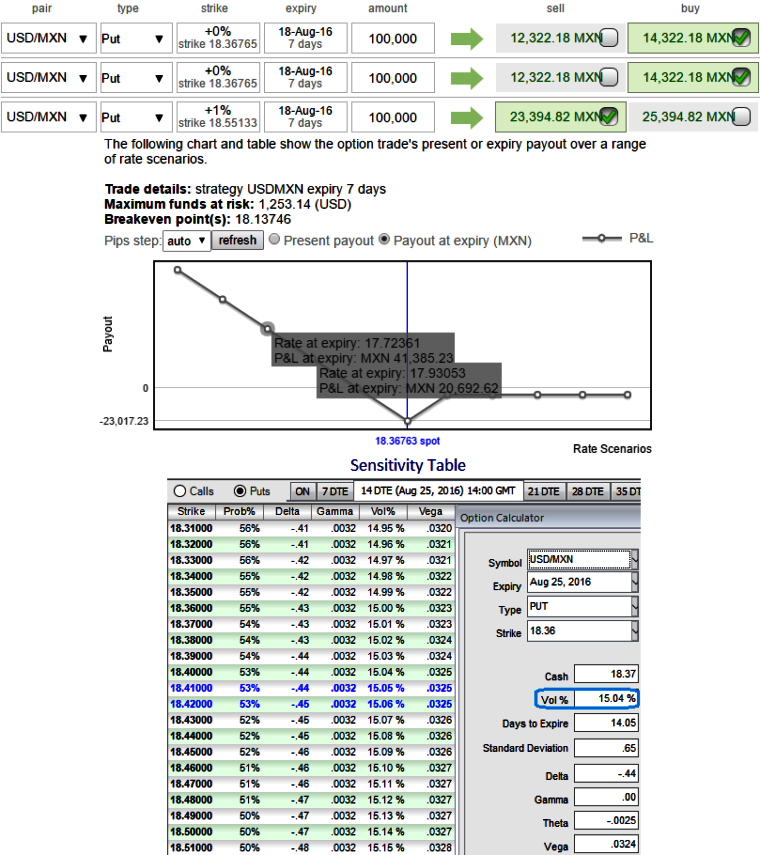 As we expect the underlying currency exchange rate of USDMXN to make a larger move on the downside. As shown in the figure purchase 1M 2 lots of At-The-Money -0.52 delta puts and sell 1W one lot of (1%) In-The-Money put option.