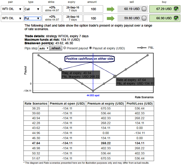Since it should not damage the crude traders we like to remain in safe zone and hence, the recommendation would be buying an ATM straddle as shown in the diagram using at the money +0.51 delta calls and simultaneously at the money -0.49 delta puts of 1w expiries, thereby, one can benefit from certain returns or arrest uncertainties in the price risks even if the pair breaks out on either side in this span of 1 weeks.