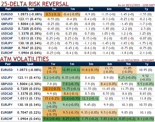 Delta risk reversals of USDJPY for next 1-3month: The OTC options market appears to be more balanced on the downward direction for this pair over the 1-3-6m time horizon and as a result delta risk reversal for USDJPY was turning into slightly negative, thereafter dollar rebounds as per delta risk reversal computation coupled with recent booming economic numbers of U.S.