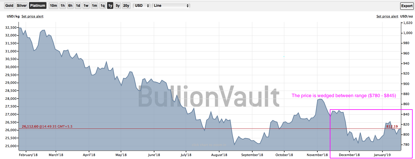 Of late, the platinum price has been oscillating between $780 - $845 range (refer 1stchart). Outside of a one-day 3% up move on January 4 (refer 2ndchart), platinum prices have been extremely stagnant of late and range- bound recently as the metal has largely failed to appreciate in sympathy with gold over the last couple of months.