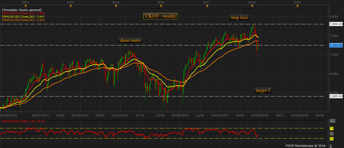 Sell FTSE100/UK100 at the current price of 7240 (UK100) and at rallies of every 100 points, targeting 5900 area with the stop loss around 7800.