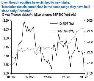 Treasury yields have remained stuck in the same range they have held since early December, even as equities have continued to rise and are now up 5% YTD (refer above diagram). In the recent times, UST yields initially rose on the back of Yellen’s semi-annual testimony before Congress, as well as a higher-than-expected CPI report, which led us to pull forward our projections for this year’s rate hikes to May and September versus June and December previously.