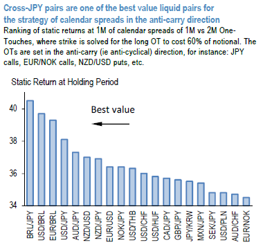 The 1st exhibit ranks -1M/+2M one-touch calendars based on their static return at 1m holding (i.e. at expiry of short leg). Cross-JPY pairs screen as one of the best value liquid pairs. We advocate monetizing the AUDJPY curve set-up via short 1M vs. long 2M one-touch spreads, capped loss vol selling constructs offering better gearing than outright one-touch shorts.