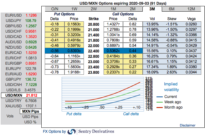 3M USDMXN ATM/25D 1*1.5 vol ratio call spread vs 22.80/25.77 indicative (spot reference: 21.731 levels).
