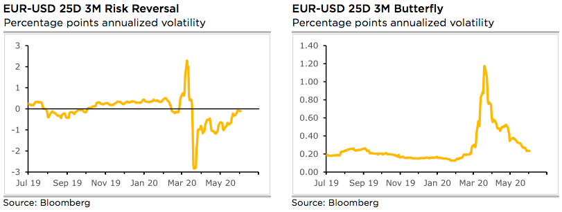EURUSD risk reversals are trading positively again for tenors below 3-months, and at almost zero for 3-months (refer left part of chart 1). Because the dollar is less suited as a safe haven? Perhaps marginally. Above all because the market is considering the risk of a second wave of the pandemic to be low and considers a major, risk-driven slide in EURUSD to be less likely. Otherwise butterflies would not be virtually back at pre-corona levels (right part of chart 1). That might be sensible pricing levels for all those market participants who can spread their risks. Anyone not able to enjoy that luxury might be pleased about this good opportunity to hedge non-diversified risks against a renewed wave of risk aversion.