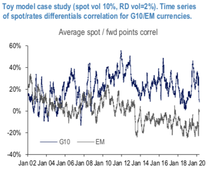 While the value of the spot/rates differential correlation plays a crucial role in the shape of the vol curve, as discussed above. Intuitively, a positive correlation between spot and rates differentials should limit the volatility of forward contracts as the effect above is countered by a move of the spot in the direction where the higher yielding currency appreciates. Same reasoning applies when rates differentials tighten. Conversely, when the correlation is negative, the effect is magnified, and forwards are expected to move more than the spot variable. The time series of average values of (3M historical correlations) for G10/EM USD pairs (refer above chart) tells a structurally different story in the two spaces. For G10 this value is positive (long-term average =20%), for EM much lower (long-term average =2%) and negative over the past 8 years. While carry investment strategies favor assets where yields are higher or faster rising, in the EM space high or rising rates are often associated with higher default risk. Typically, the dynamics between rates and FX depends on the currency more granular details on individual currencies investigated will be shared later. Courtesy: JPM