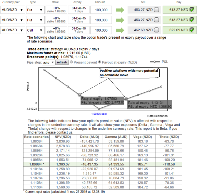 The strategy has a delta of 0.48 which means if the underlying pair moves up 1 pip then price of the ATM option will go up by 0.48.