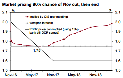 The markets betting odds for a November OCR cut has been very unwavering during in the recent past at probabilities slightly more than 80%. However, the market now reckons any further easing beyond Nov as a zero chance and is now instead pricing in some chance of tightening during the year ahead (see above chart).