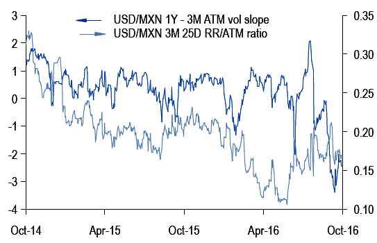 From the above chart, it is understood that the frontend options MXN vol shorts are better instituted in shorter-tenors given the extreme inversion of the vol surface, and via USD puts/MXN calls since risk-reversal / ATM ratios are still low (see above chart).