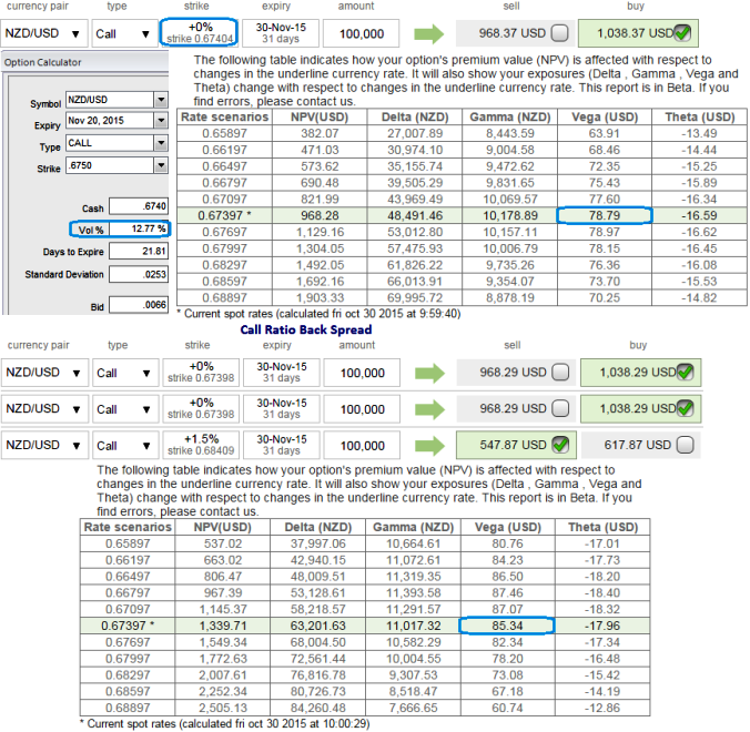 The current IV of NZDUSD call is reducing to 12.77% from 14.59% which is good for option holders, usually if the Vega of a long option position is positive and the implied volatility rises or dips, the below stated option prices are directly proportional to the implied volatility.
