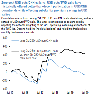 Initiated long 2M 1% OTMS USD put/CNH call vs. short 1M 1.75% OTMS USD put/TWD call @ zero cost. Both legs held live (no delta-hedging). Courtesy: JPM