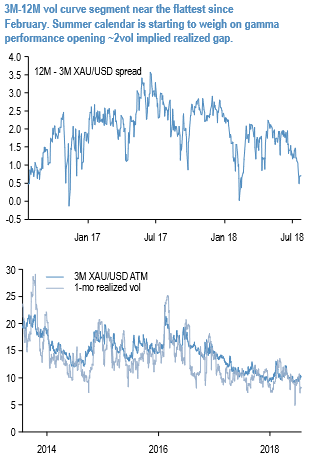 Following the July bounce, 3M implied vol is 1vol from the YTD low and full 2pts above the RV. Moreover, with 1Y vol hitting multi-decade lows, at 0.7 vols 1Y-3M gold vols curve slide is near the lowest since February (refer 1st chart), and 2 sigma too narrow by historical standards (with the 1-year look back).