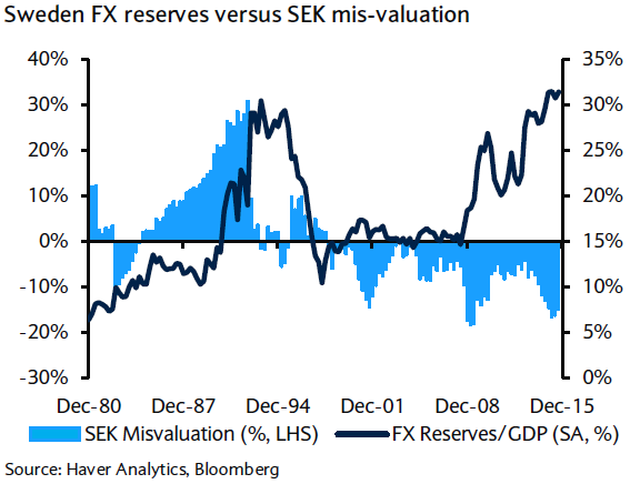 A repo rate cut will likely be preferred over FX intervention, as the SEK remains cheap and FX reserves are already historically large. Foreign exchange reserves in Sweden increased to 493,738 SEK million in January from 493,210 SEK million in December of 2015.