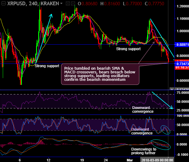 Ripple (XRPUSD) price has been tumbling on bearish SMA and MACD crossovers, consequently bears managed to breach below strong supports at 0.8897 and 0.7347 levels (refer 4H chart).
