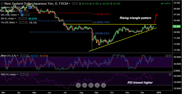 - Rising triangle pattern found on NZD/JPY charts, with strong resistance at 83.20 trendline.