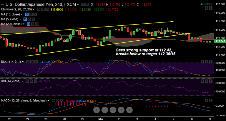 - Immediate resistance is seen at 113 (Feb 23rd highs) , while support on the downside is seen at 112.30 (Feb 19th lows).