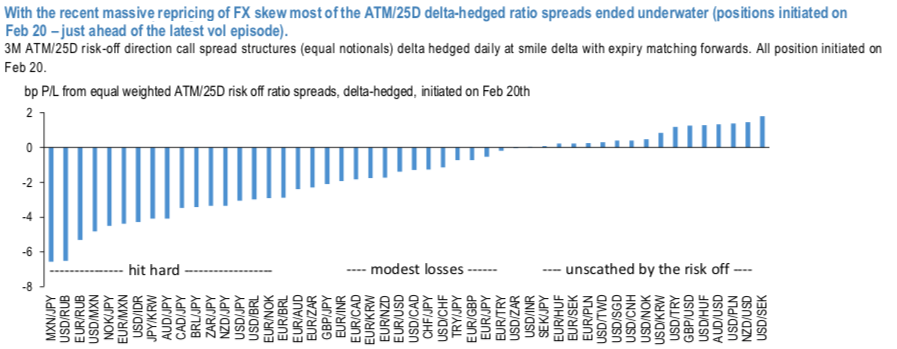 The entire global market sentiment has been driving strictly defensive positioning we think that it is prudent to keep an eye on historic skew dislocations their theta-scalping via risk off ratio spreads (delta-hedged). Those are a class of structures that can efficiently monetize excessive risk premia in vol smiles. While ratios can be struck for both calls and puts, the recent vol episode pushed the pricing of risk of OTM strikes into uncharted territory and made of particular interest the structures where the short notional is placed on the “risk-off” side, i.e. selling risk-reversals. While such structures are quicker in collecting premium, exposure to left tail is notable.