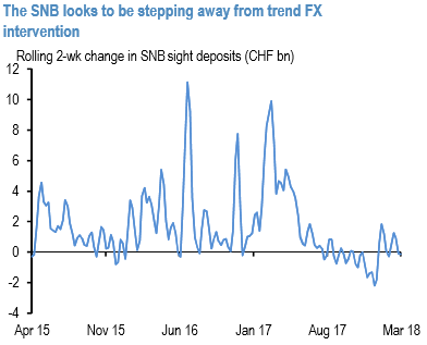 On the latter, SNB sight deposits have now declined CHF 4bn or 1% from their peak last August, and the SNB does seem to be stepping aside from trend FX intervention (refer 1st chart).