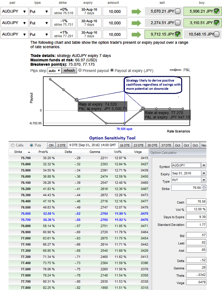 As we expect the underlying currency exchange rate of AUDJPY to make a larger move on the downside. As shown in the figure purchase 1M 1 lot of at the money -0.51 delta put, 2M 1 lot of (1%) out of the money -0.35 delta put and sell 2W one lot of (1%) In-The-Money put option.