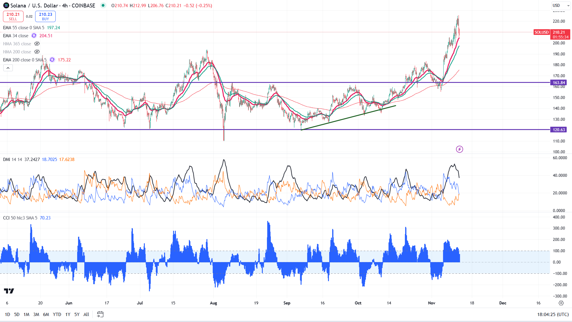 SOLUSD pared most of its gains after hitting a multi-month high $225 and is trading around $207. The near- term support is around $200 and any violation below that could target $180/$160/$145/ $127, $120, or $110.