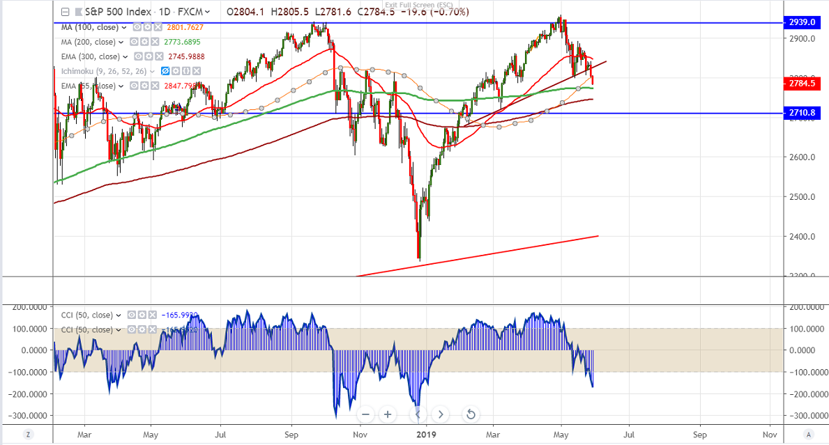 S&P500 is trading weak for past two days and lost more than 50 points on renewed trade tension. The index hits intraday low of 2783 and is currently trading around 2785.30. In the month S&P500 has lost more than 5.5% from high 254. It is currently trading around 2785.