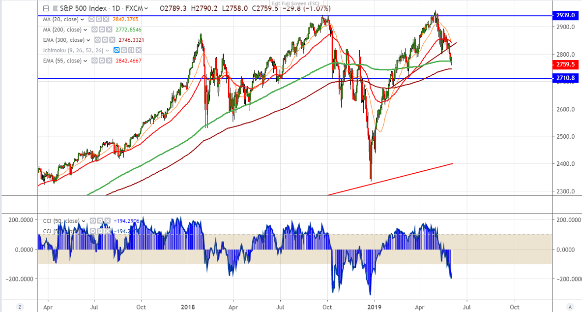 S&P500 continues to trade lower and lost more than 1%.In this month the index declines more than 6.5% on account of renewed trade war.US President Trump said that US will impose 5% on Mexican imports from Jun 10th 2019 and to put additional tariff of 25% if Mexico does not “reduce or eliminate number of illegal aliens”. US 10 year yield hits 20 -month low at 2.17%. The yield curve inversion (3 month and 10 year yield) indicates chance of recession and spread widened to 18 basis point from 10 basis point. The index hits intraday low of 2758 and is currently trading around 2761.90.