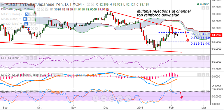 - AUD/JPY was rejected by strong falling trendline resistance on 29th Jan, 1st and 2nd Feb trades.