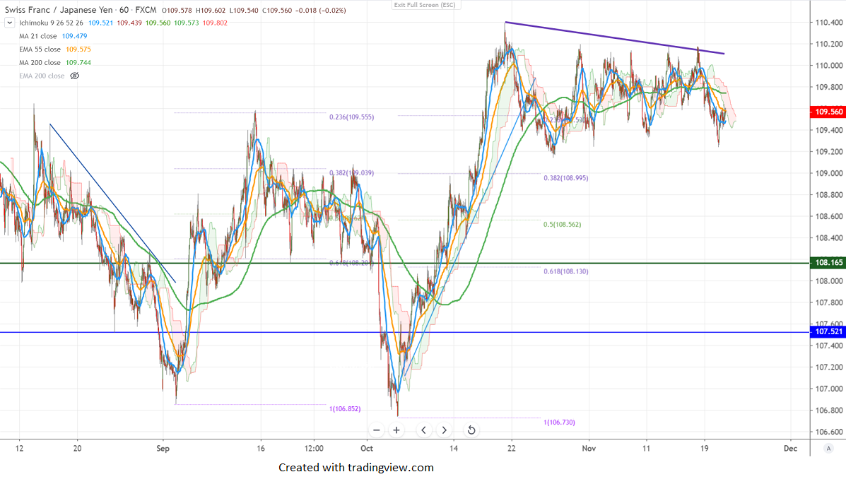 As per our analysis, CHFJPY is trading weak for the past two days and hits a low of 109.24. The pair has shown a minor jump to 109.63 and is currently trading around 109.58.