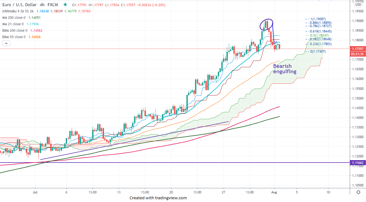 EURUSD continues to trade weak after hitting a 2-year high 1.19050 despite strong Eurozone PMI. It came at 51.8 in July compared to a forecast of 51.1. The US GDP released on Friday came much worse at –32.9% annualized vs Eurozone GDP of -12.1%. Markets eye US ISM manufacturing index data, which is to be released today for further direction. It hits an intraday low of 1.1750 and is currently trading around 1.17526.