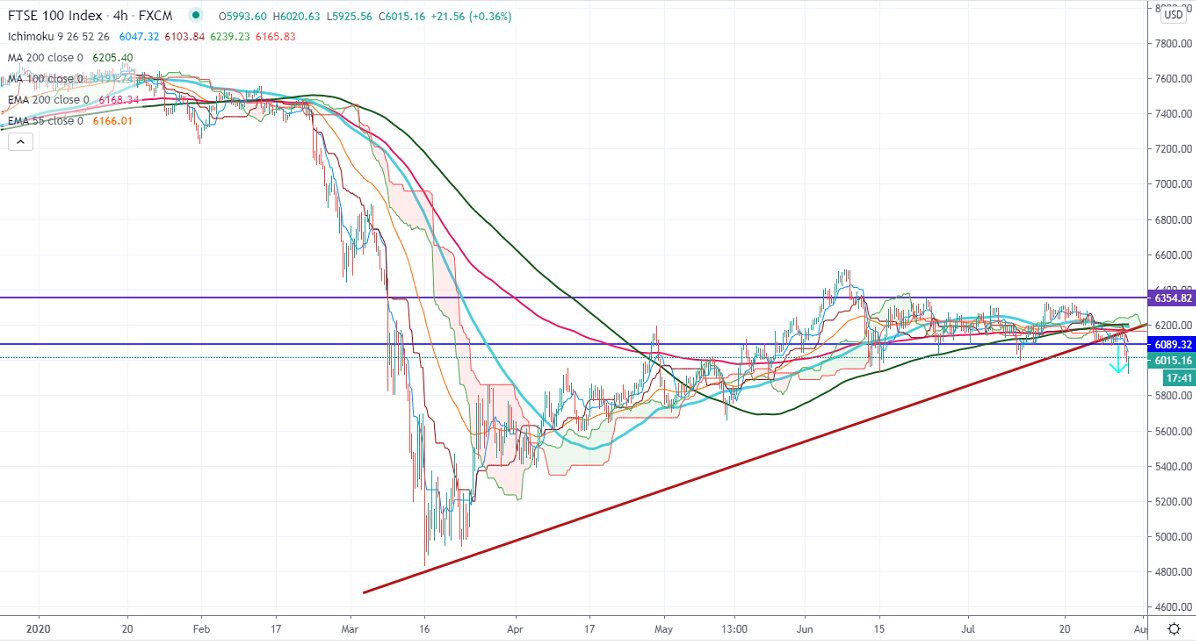 FTSE100 continues to trade lower after three days of consolidation. The escalation of the US-China trade war and the second wave of coronavirus concerns is dragging index further down. The number of new cases is getting increased in Spain for the past few days. The UK has removed Spain from the list of countries deemed safe to travel. The S&P futures are trading weak and lost more than 0.80%. It is currently trading around 3226.