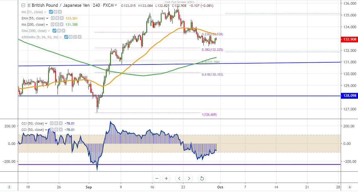 GBPJPY is consolidating after hitting a low of 132.32. The pair recovered till 133.25 and is currently trading around 133. It has formed a temporary top around 135.75 and is currently trading around 132.88. GBP jumped more than 50 pips after hitting support near 200-4H MA. It is currently trading around 1.23279.