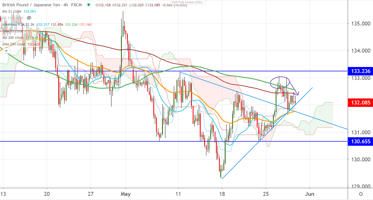 In the 4 hours chart it is trading below 200-4H MA at 132.56, any break below 132 confirms intraday weakness. A decline till 131.40/130.66 is likely. Any indicative break below 130.65 targets 130/129.25.