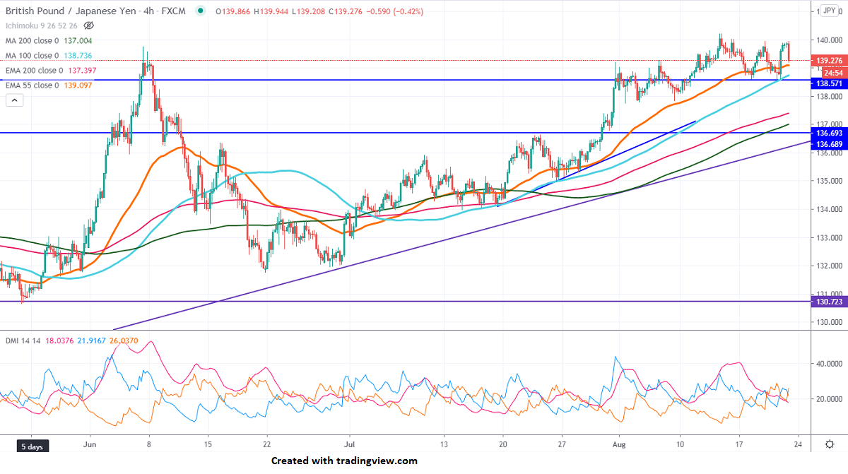 The 4-hour chart shows that the pair is holding above 55EMA and 100 MA. Any break below 138.70 (100 MA) will drag the pair down till 138/137.40. The near term resistance is around 140.20, any break above targets 141.10/142.