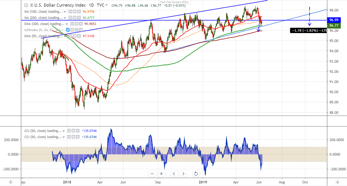 US dollar index is consolidating after hitting low of 96.45.The index was trading weak for past 1 week and lost more than 150 pips .The decline was mainly due to dovish comments by Fed which has increased chance of rate cut and weaker than expected US jobs data.The US 10 year bond yield hits 2.05% lowest level since Sep 2017. The index recovered till 96.94 from low of 96.46 and is currently trading around 96.72.