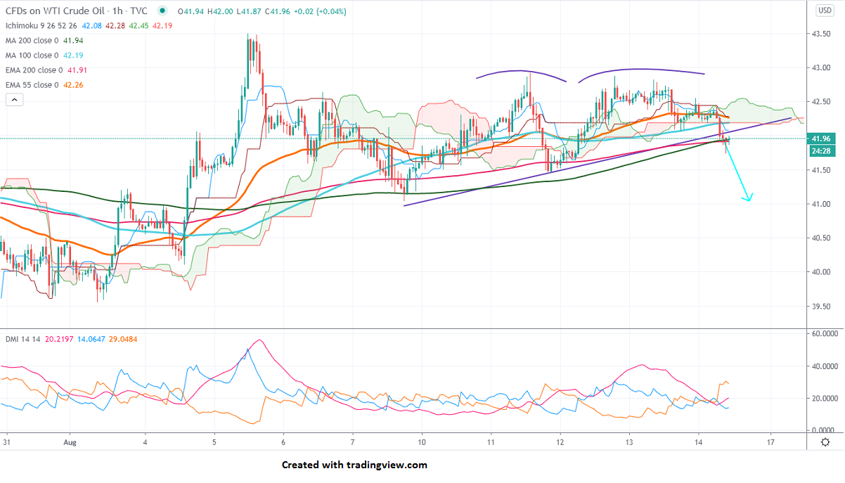 The pair is trading well below Tenken-Sen and Kijun-Sen, a significant move only if it breaks below $41.89. Any indicative violation below will drag the commodity $41.50/$40.50/$40. Significant selling only if it breaks $38.50.