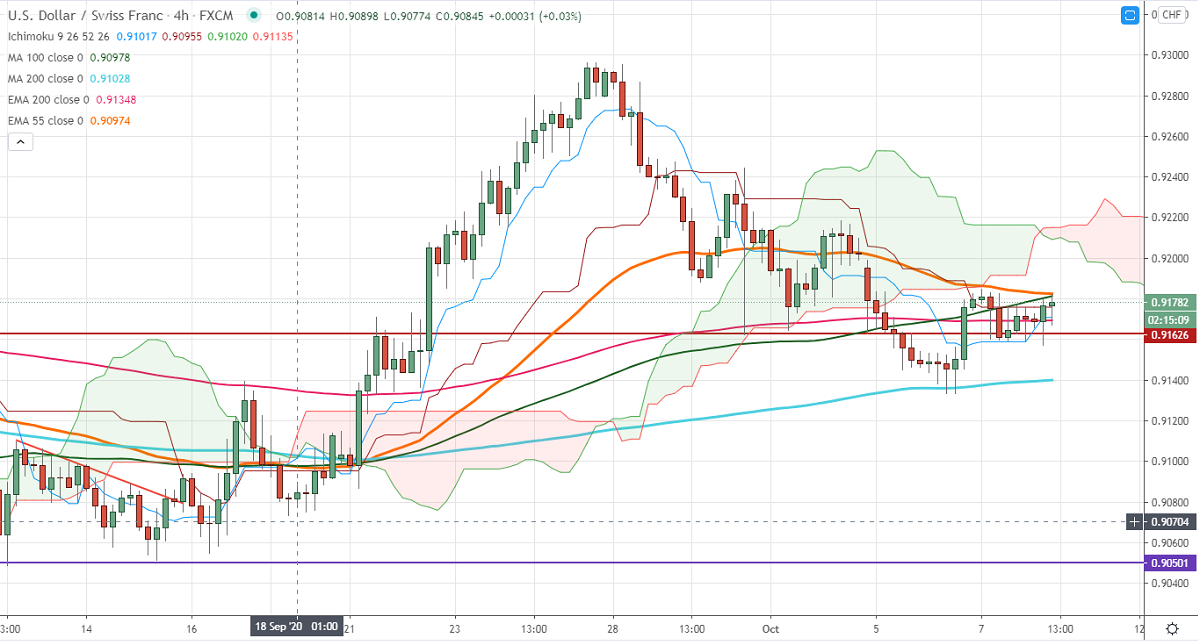 USDCHF is consolidating in a narrow range between 0.91845 and 0.91596 for the past three days. The global markets gained sharply on fresh stimulus package hopes, especially for the airline industry. The US Fed minutes clearly stated that there will not any interest rates hike until full employment reached. DXY is struggling to break above 94 levels on upbeat market sentiment. USDCHF hits a high of 0.91820 at the time of writing and is currently trading around 0.91789.
