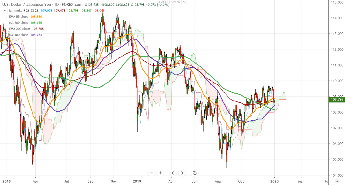USDJPY is trading weak for 3rd consecutive days and lost more than 100 pips. The dip was mainly due to broad-based US dollar selling. US President said on Tuesday that Phase 1 of a trade deal will be signed on Jan 15th but still uncertainty prevails. It hits a low of 108.46 and is currently trading around 108.78.
