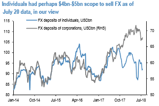 We believe the lira will sell-off further despite the muted reaction so far. The currency reacted negatively on the day but hasn’t sold off substantially yet. The retail sector still has some scope to sell FX but not large. We believe the retail sector had about $4bn$5bn scope to sell FX further as of data available up to July 20. We arrive at this figure by assuming individual investors can run down FX balances towards the low end of their recent range (refer 1st chart). However, some of this selling buffer was likely already used after the CBRT decision and hence it is again smaller now. Meanwhile, we do not assume any further scope for corporates to sell given that they currently hold only marginally more than their short-term FX liabilities.